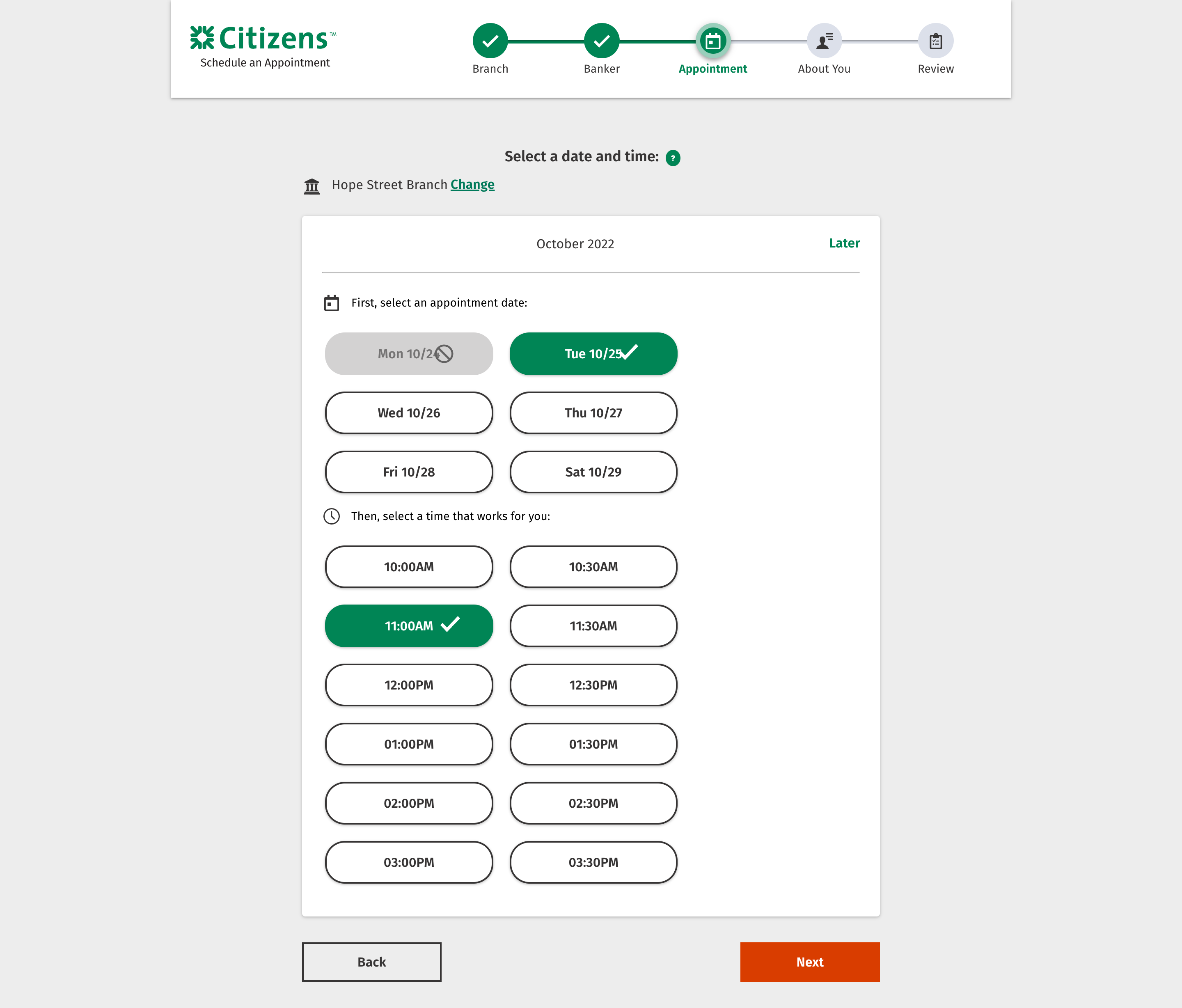 Most of the design work went into refining each module screen. The existing system defined which features were available for the Appointment experience. The refined designs aimed to take advantage of what worked in the existing system, and drop features that did not support the banker or customer journey.